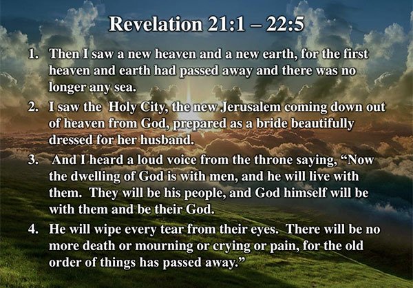 21 Then I saw “a new heaven and a new earth,”[a] for the first heaven and the first earth had passed away, and there was no longer any sea. 2I saw the Holy City, the new Jerusalem, coming down out of heaven from God, prepared as a bride beautifully dressed for her husband. 3And I heard a loud voice from the throne saying, “Look! God’s dwelling place is now among the people, and he will dwell with them. They will be his people, and God himself will be with them and be their God. 4‘He will wipe every tear from their eyes. There will be no more death’ or mourning or crying or pain, for the old order of things has passed away.” 5He who was seated on the throne said, “I am making everything new!” Then he said, “Write this down, for these words are trustworthy and true.”